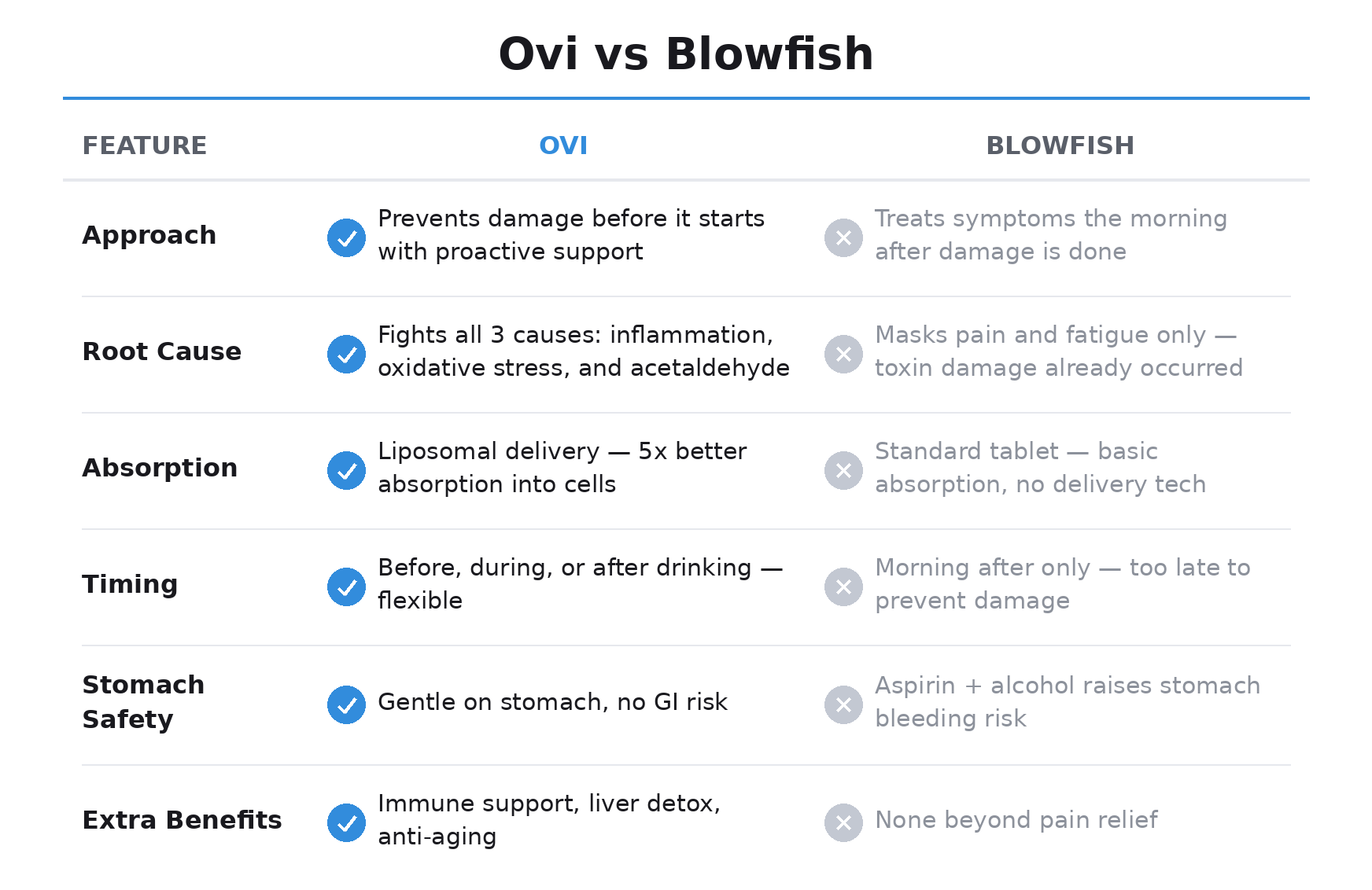 Ovi and Blowfish are fundamentally different products for different stages of after-alcohol support. Ovi supports your body when you drink through root-cause intervention; Blowfish relieves symptoms after they’ve developed through symptomatic relief. They’re not competitors; they’re complementary components of comprehensive support when drinking.For maximum support, use Ovi before and during drinking to prevent hangover formation in the first place. For any lingering symptoms the next morning despite Ovi, Blowfish provides excellent acute relief. Together, they create a comprehensive support when drinking strategy that addresses both prevention and symptom management. The ultimate stack—Ovi for prevention plus Blowfish for backup symptom relief—represents the most complete hangover management approach available.